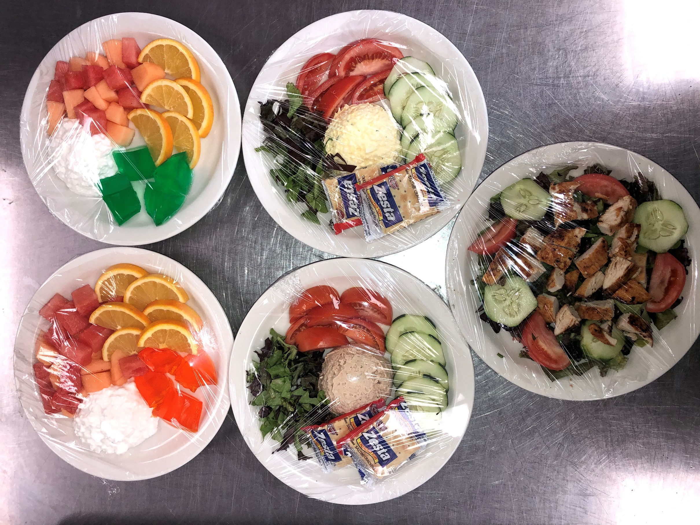 Featured are some of our plate selections from our alternate menu. They are cottage cheese with fruit, chef salad, garden salad and a grilled chicken salad. All of these options are available daily and can be altered according to the residents diet.